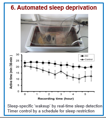 Sleep pattern Sleep: Total sleep/wake monitoring; step-through passive/active avoidance test; automated sleep deprivation